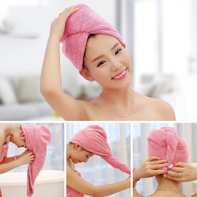 Kształt ręcznika został zaprojektowany tak aby łatwo było go założyć na włosy. Posiada praktyczny guzik, dzięki czemu turban jest stabilny.